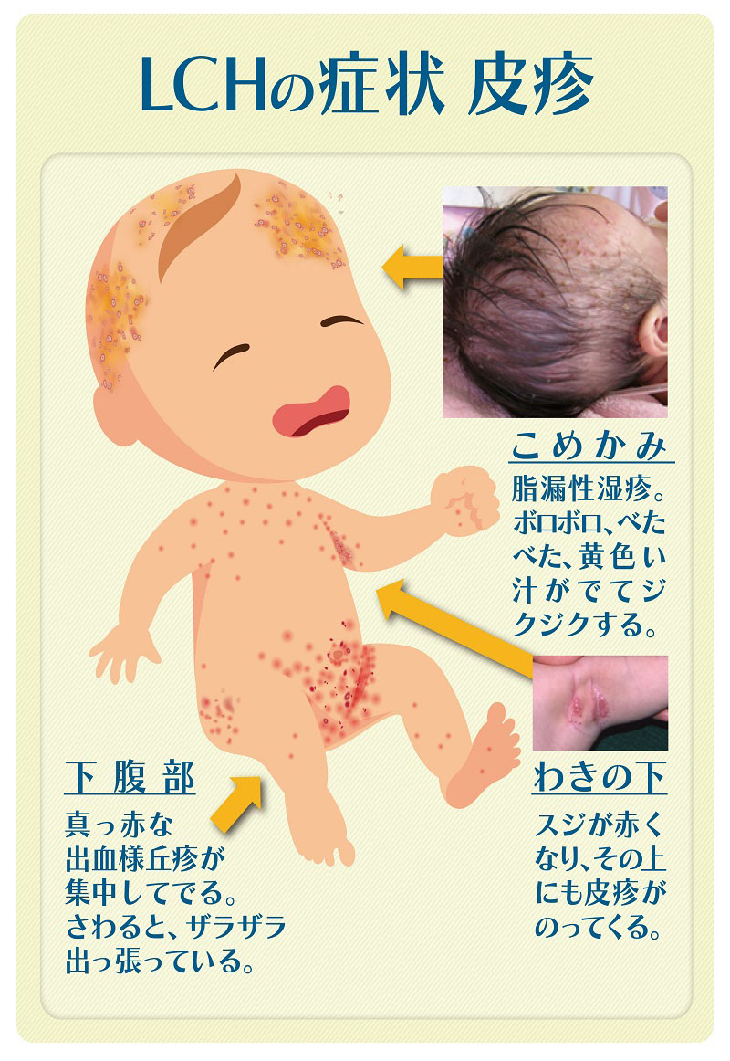 生まれて数か月の赤ちゃんによくみられるような頭皮の脂漏性湿疹が、LCHの場合には少し大きい月齢になっても出現することが特徴的です。