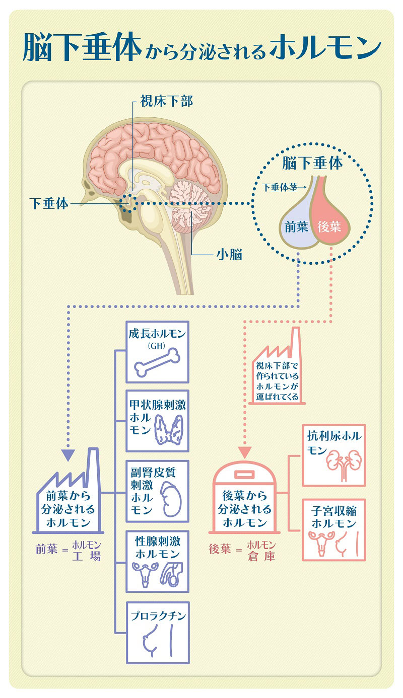 下垂体前葉では、成長ホルモンや性腺刺激ホルモンをはじめ、甲状腺刺激ホルモン、副腎皮質刺激ホルモンなどのたくさんの重要なホルモンが作られています。一方、後葉ではホルモンは作られることはなく、ここには視床下部で作られ下垂体茎を通ってやってきた抗利尿ホルモンが主に貯留しています。いわば、前葉はホルモン工場、後葉はホルモン倉庫のような役割です。