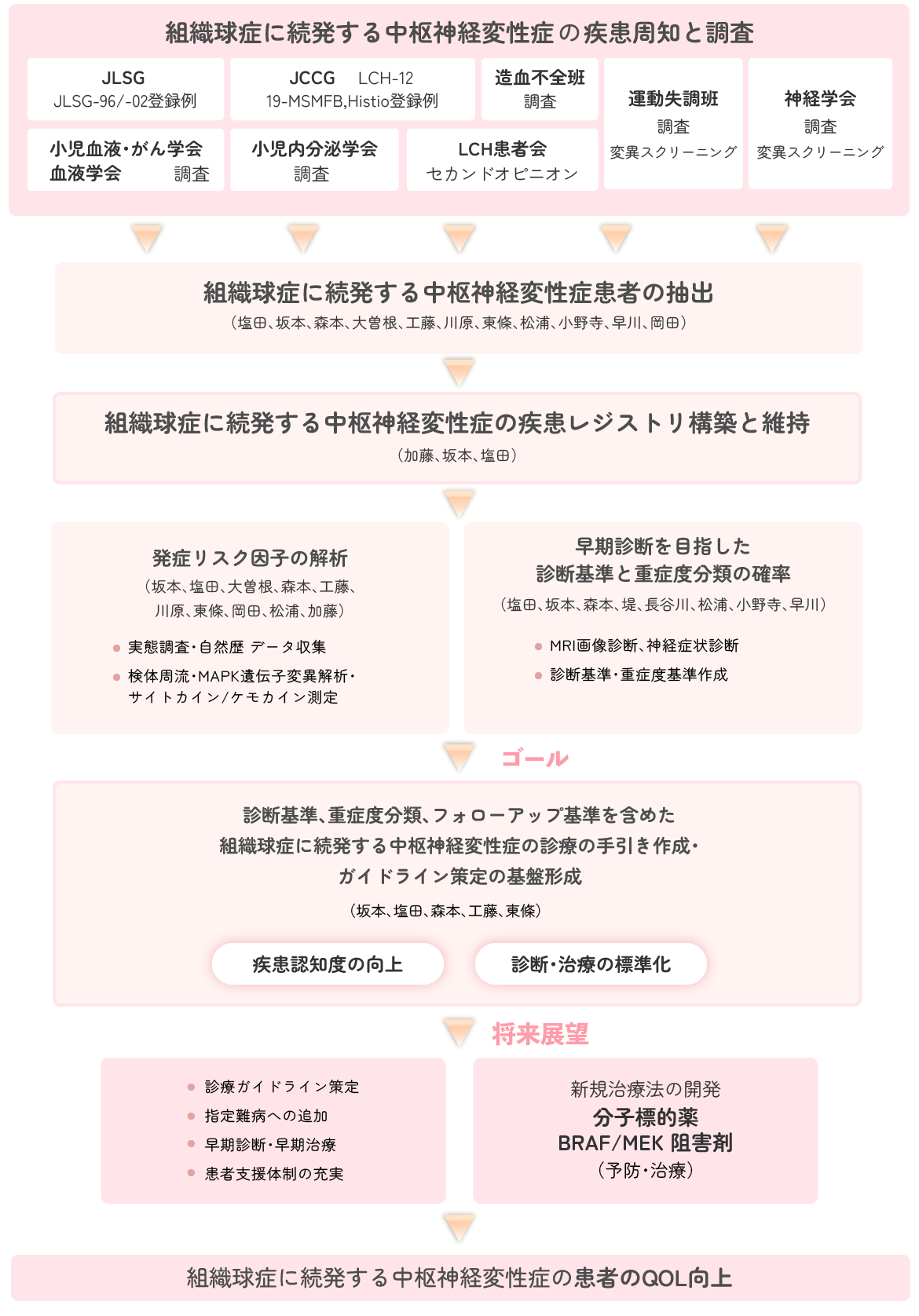本研究では組織球症に続発する神経変性症(Histiocytosis associated neurodegenerative disease, Histiocytosis-ND)の診断および治療のためのエビデンスを創り出すことを目的としています。