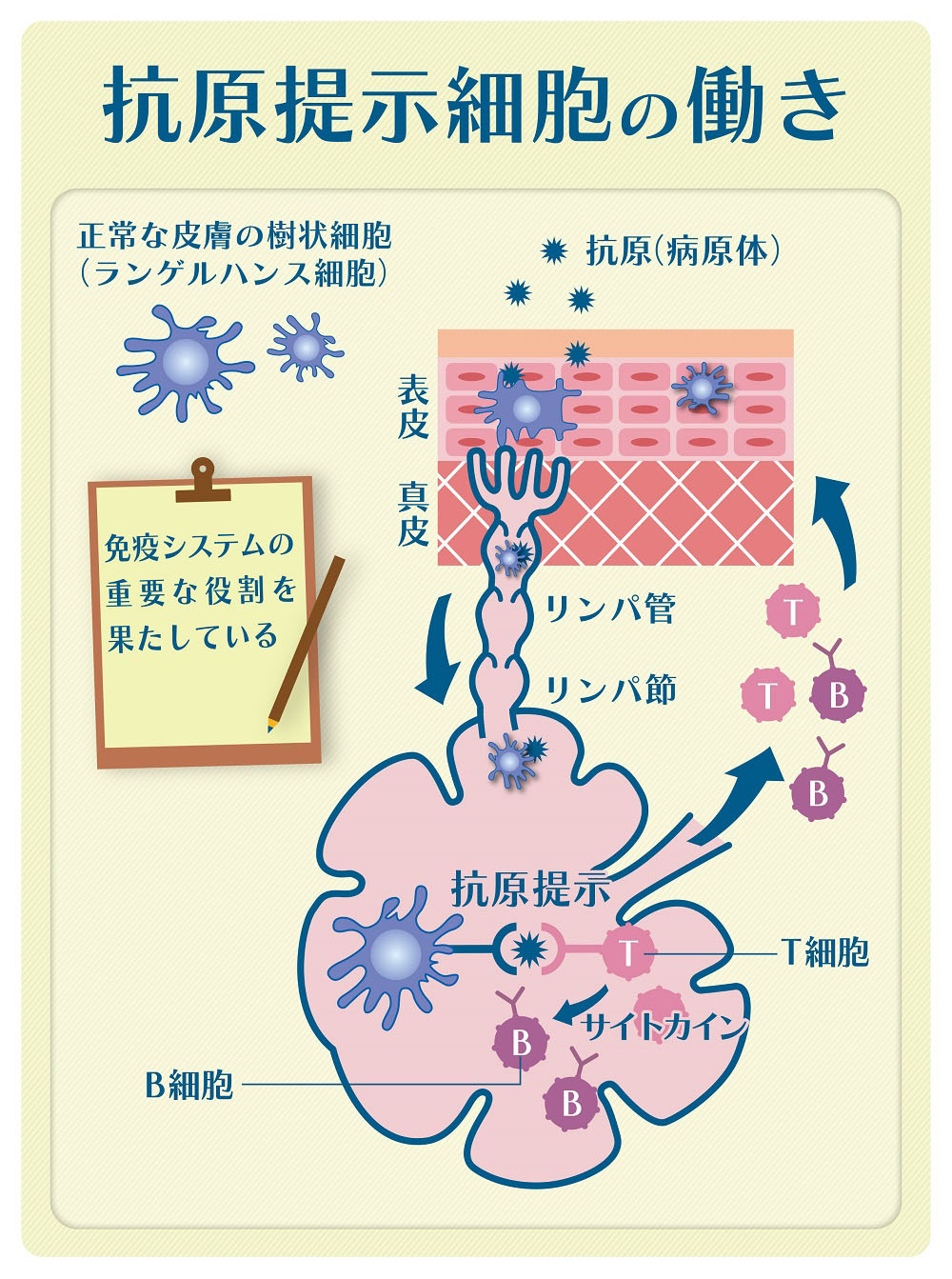 ランゲルハンス細胞は、人の体の中で外界と接している皮膚のほか、気道や消化管などに存在しており、周囲の免疫担当細胞に情報を伝える「抗原提示細胞」としての役割を担っており、いつもわたしたちの体を守ってくれています。