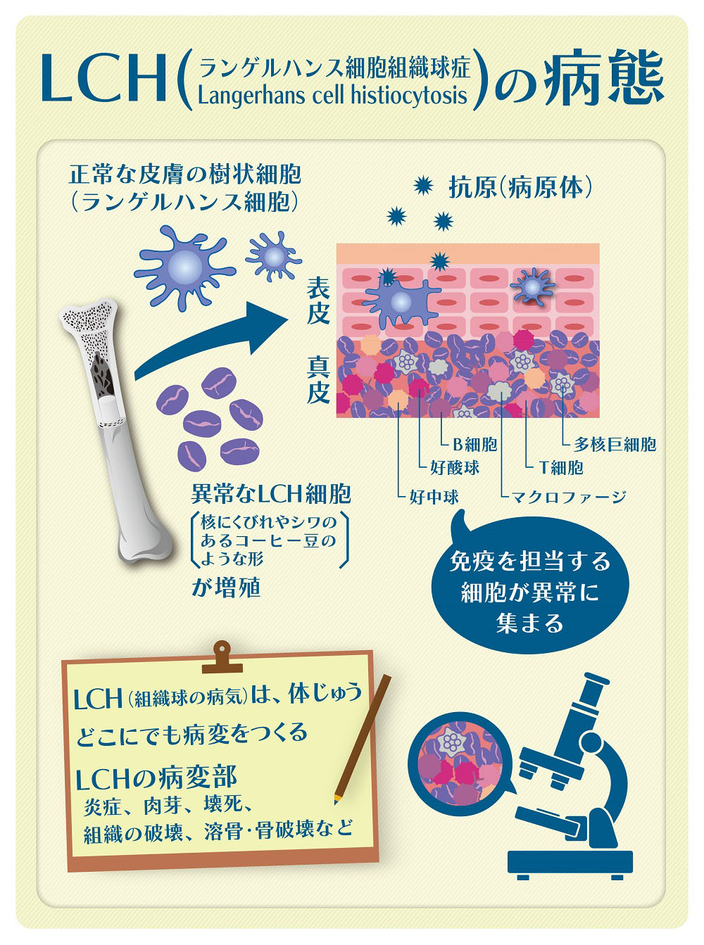 LCHの診断は、病変部から小さな組織を採取する「生検」を行って、病理組織を詳しく検討します。顕微鏡で見ると、病気の部分には異常なLCH細胞がとてもたくさん増えている様子が観察できます。 LCH細胞は、正常なランゲルハンス細胞とは異なり、核にくびれやしわがあってコーヒー豆のようにみえます。同時に、リンパ球や好中球、マクロファージ、好酸球など、炎症を担当する細胞も多く集まってきています。