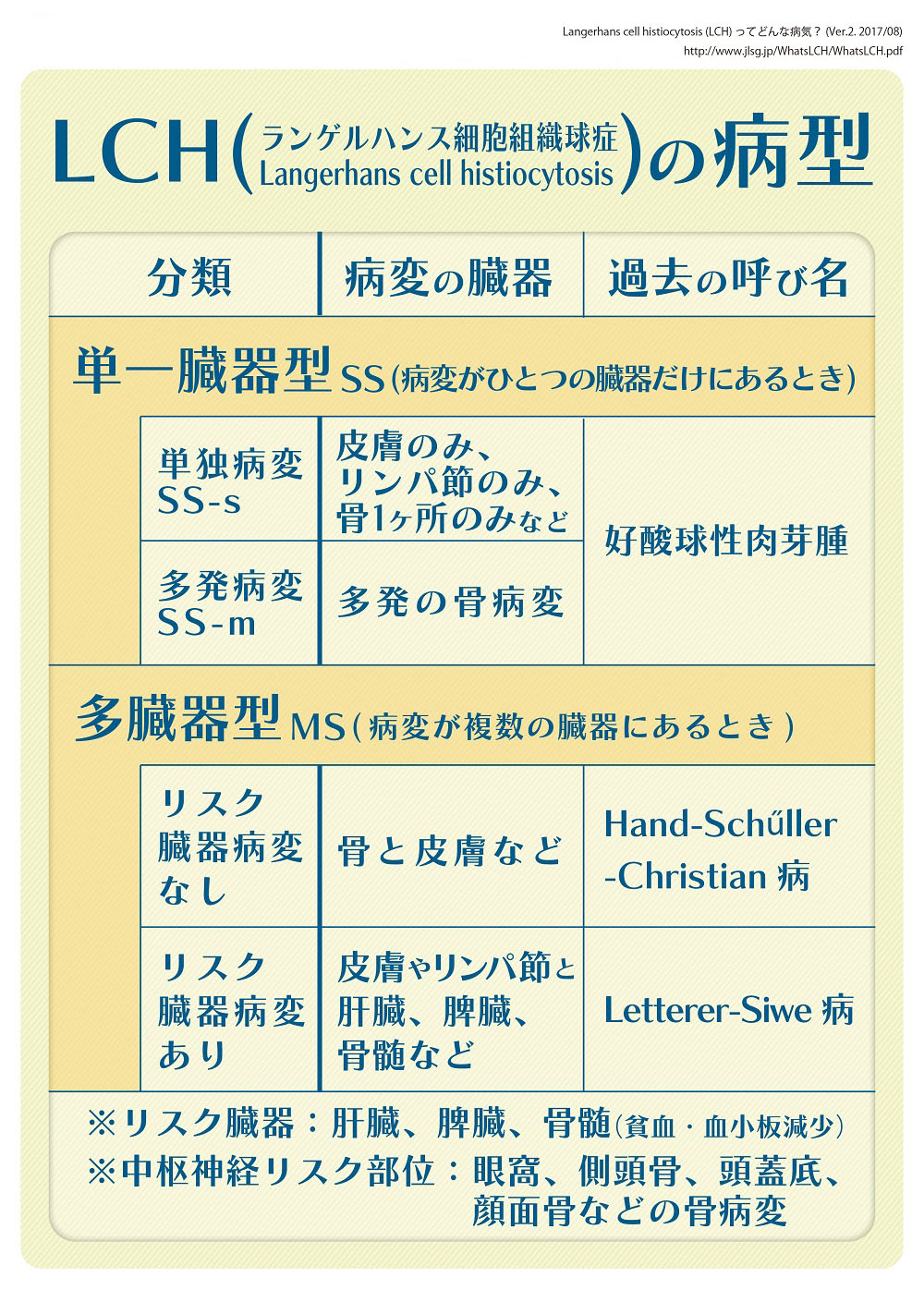 さらに、これまでの研究の結果から、”ちゃんと治療しなければ治りにくい“と考えられているリスク臓器に病変があるかどうかが重要です。たとえば肝脾腫があると、「リスク臓器浸潤のある多臓器型」などと分類し、より慎重に治療経過を見守っていくようにしています。