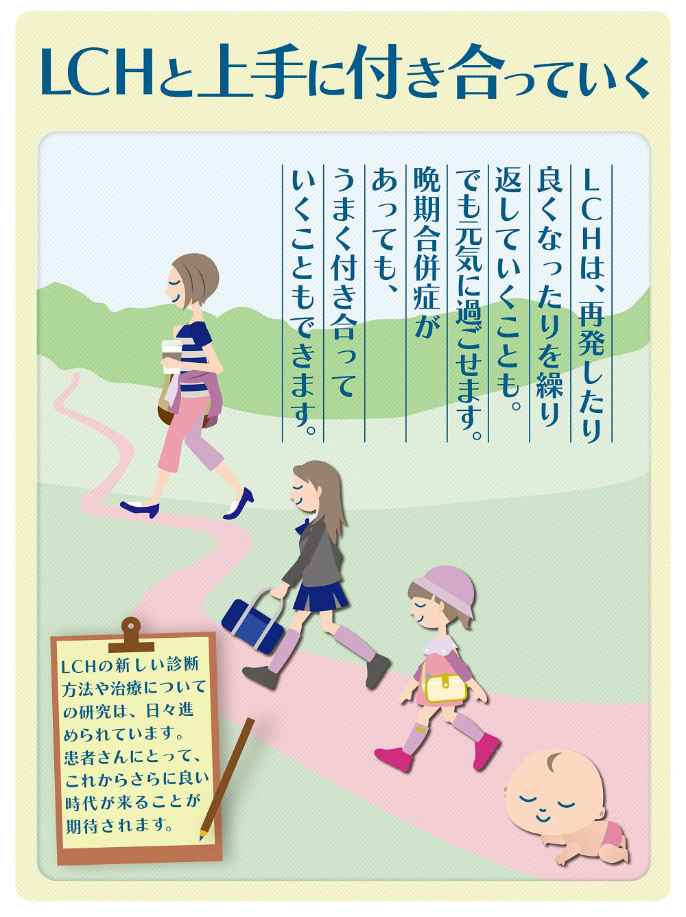 また、患者さんの立場からも、最近はセカンドオピニオンを自由に聞ける時代になったほか、患者さんの会も活動しており、相談できる場が増えています。LCHをよく知るひとたちとLCH について話す機会を持つことは、一人で悩んでいるより心強いかもしれません。
