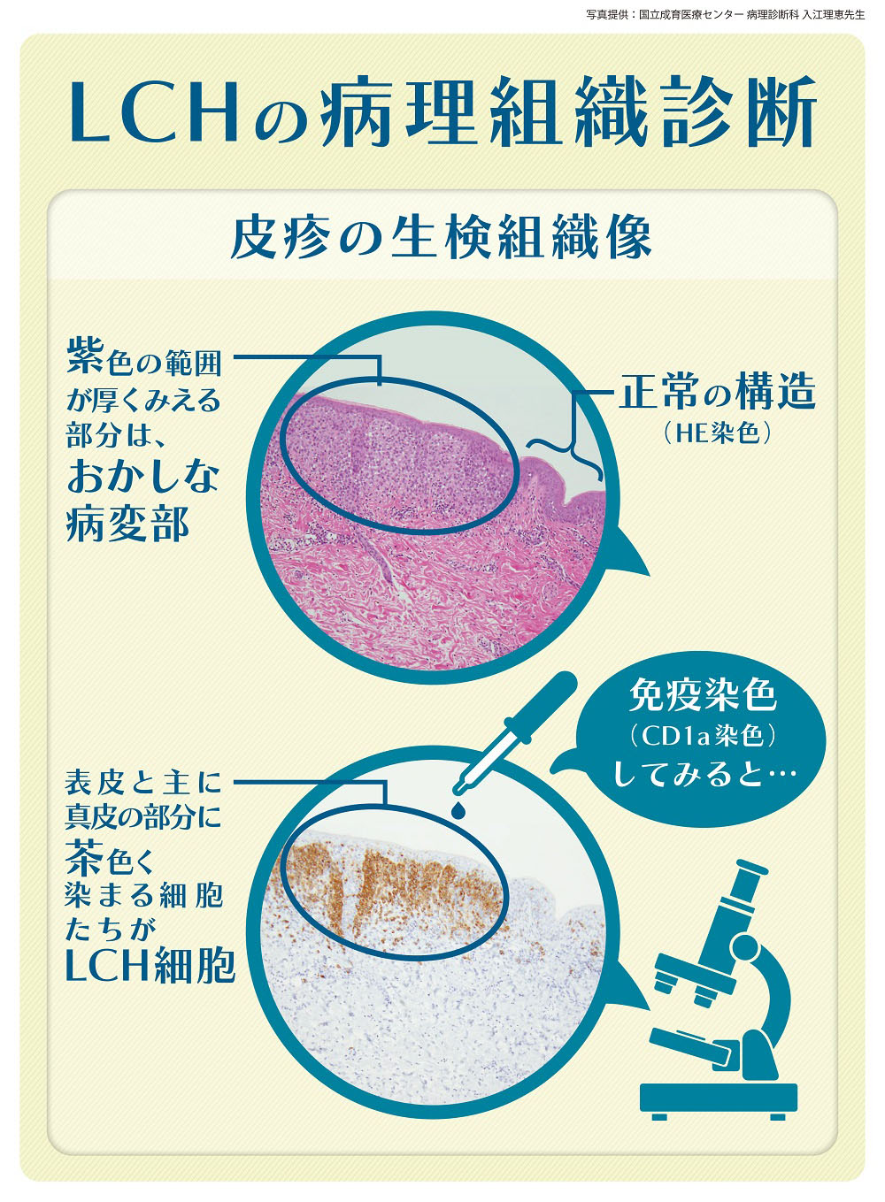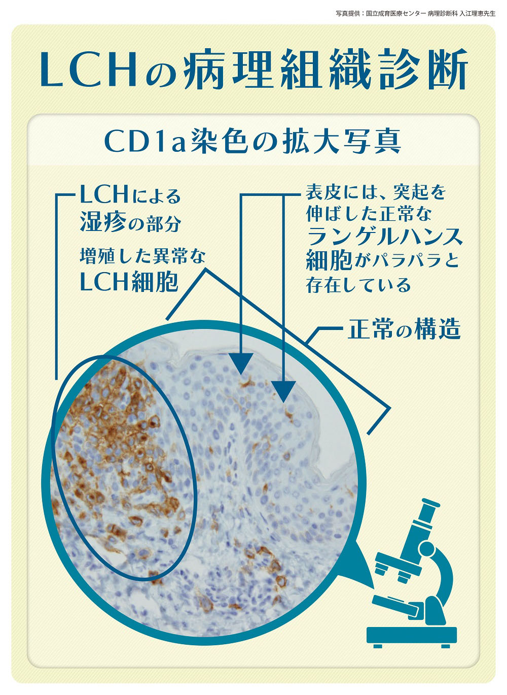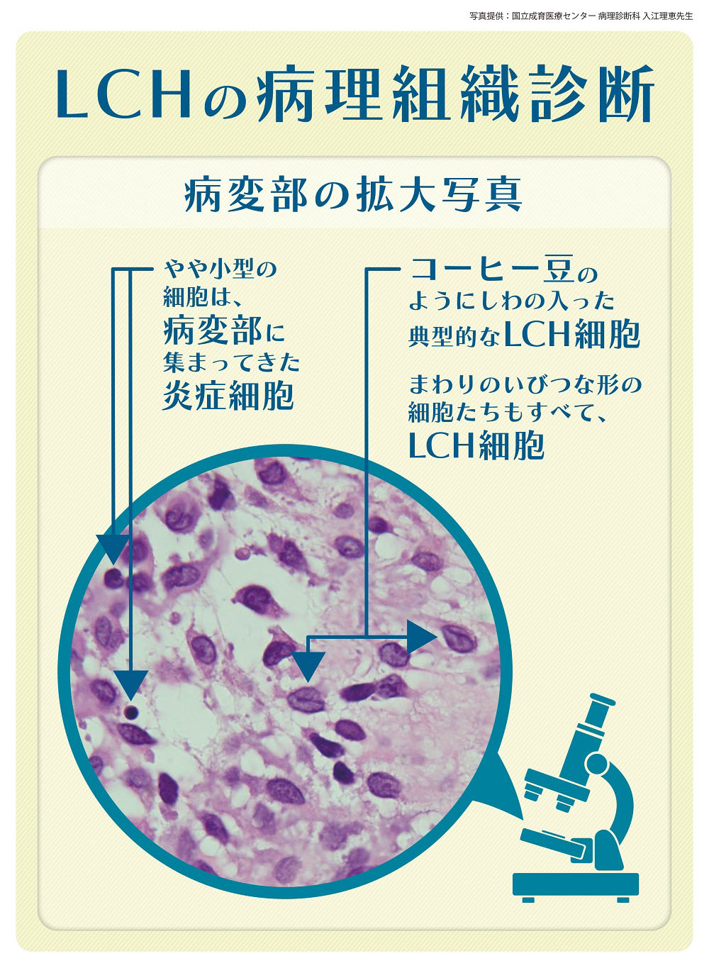 病変部の組織にLCH細胞が増えている状態を証明することによりLCHと診断します。