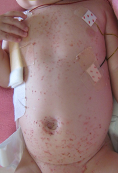 生まれたての赤ちゃんの時から、全身に少し大きめ(5mm前後など)の紫色の丘疹があちこちに散らばってみられることがあります。欧米では、まるでブルーベリーマフィンのようだと表現されます。