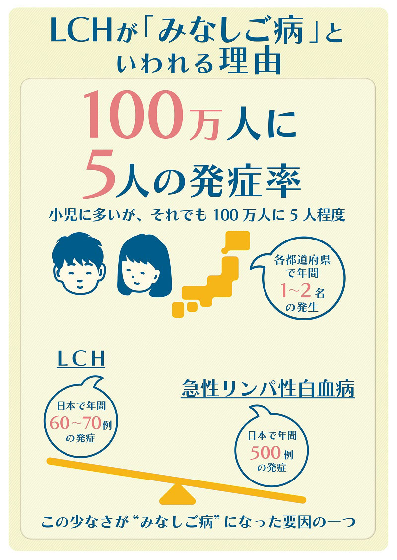 LCHは小児期に頻度が高い病気ですが、それでも小児100万人あたり5人程度の発症率で、日本で年間60-70例の発生と言われています。各都道府県で年間1-2名の発生ですので、“rare disease”であるといえます。