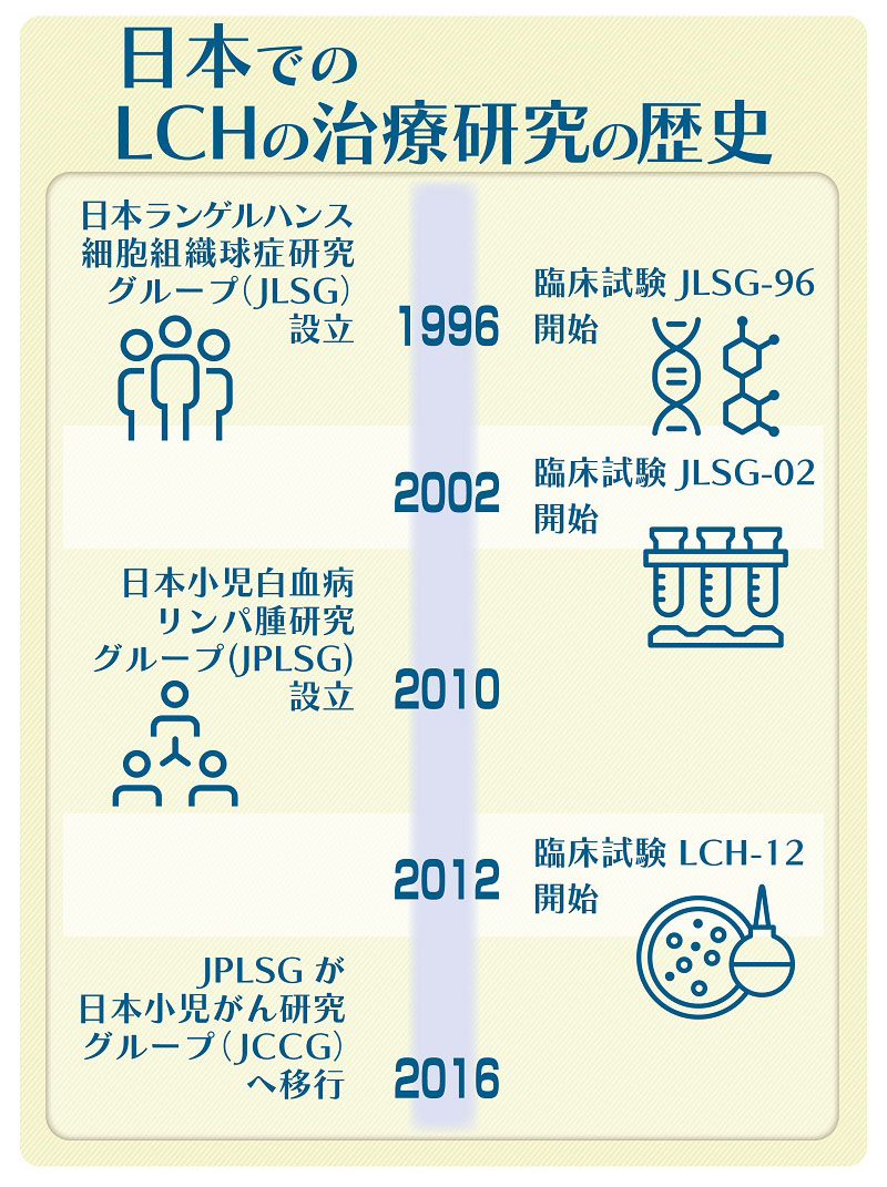 1996年に開始した臨床試験であるJLSG-96は、その後改良されてJLSG-02となり、日本の多くの小児期発症LCHの患者さんが、この臨床試験に参加されました。