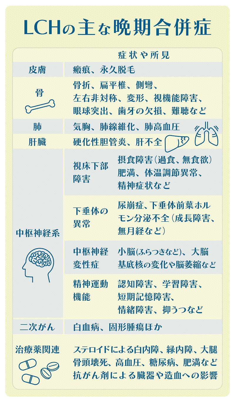 LCHの勢いがすっかりおさまり、病気の治療が終わったあとにも、ずっと残っていく問題のことを「晩期合併症」や「晩期障害」と表現します。