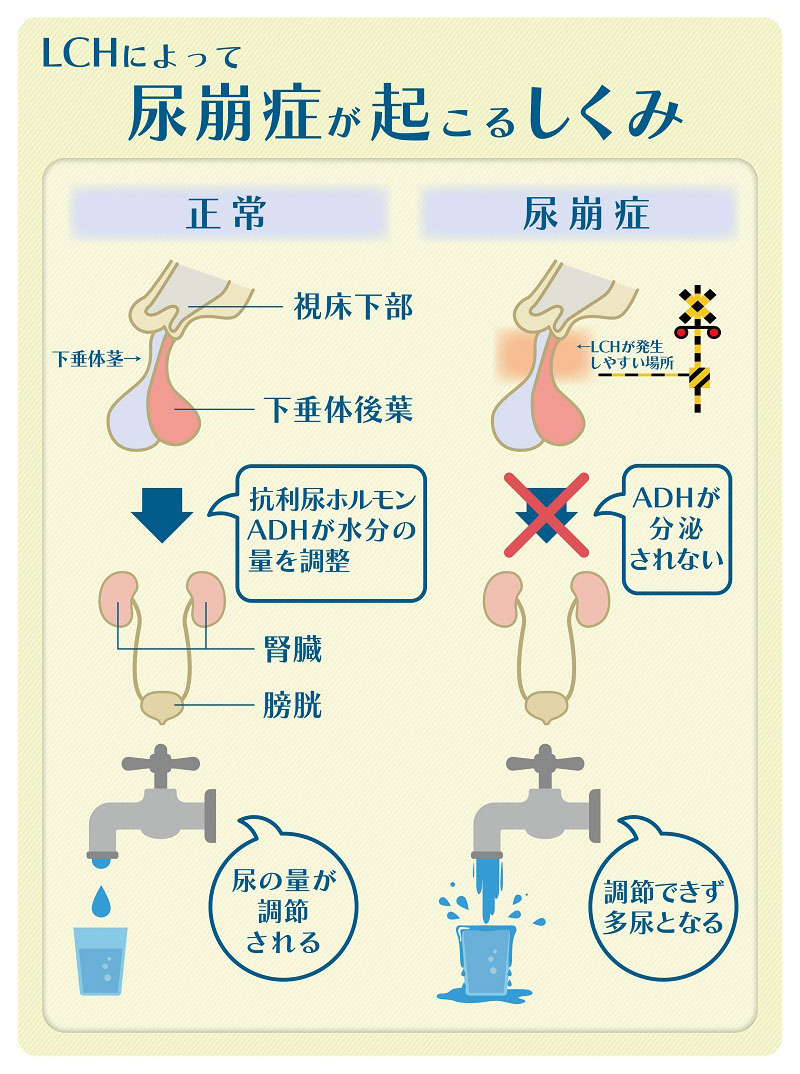 LCHの晩期合併症として代表的な中枢性の「尿崩症」は、尿量の調節ができず大量の尿が排泄される病気です。 下垂体茎が腫大したために、抗利尿ホルモンが視床下部から下垂体後葉までたどりつけないことによって生じます。1日に数リットルという多飲多尿の症状を呈する尿崩症は、LCHの初発症状としてだけでなく、晩期合併症としても起こりえます。
