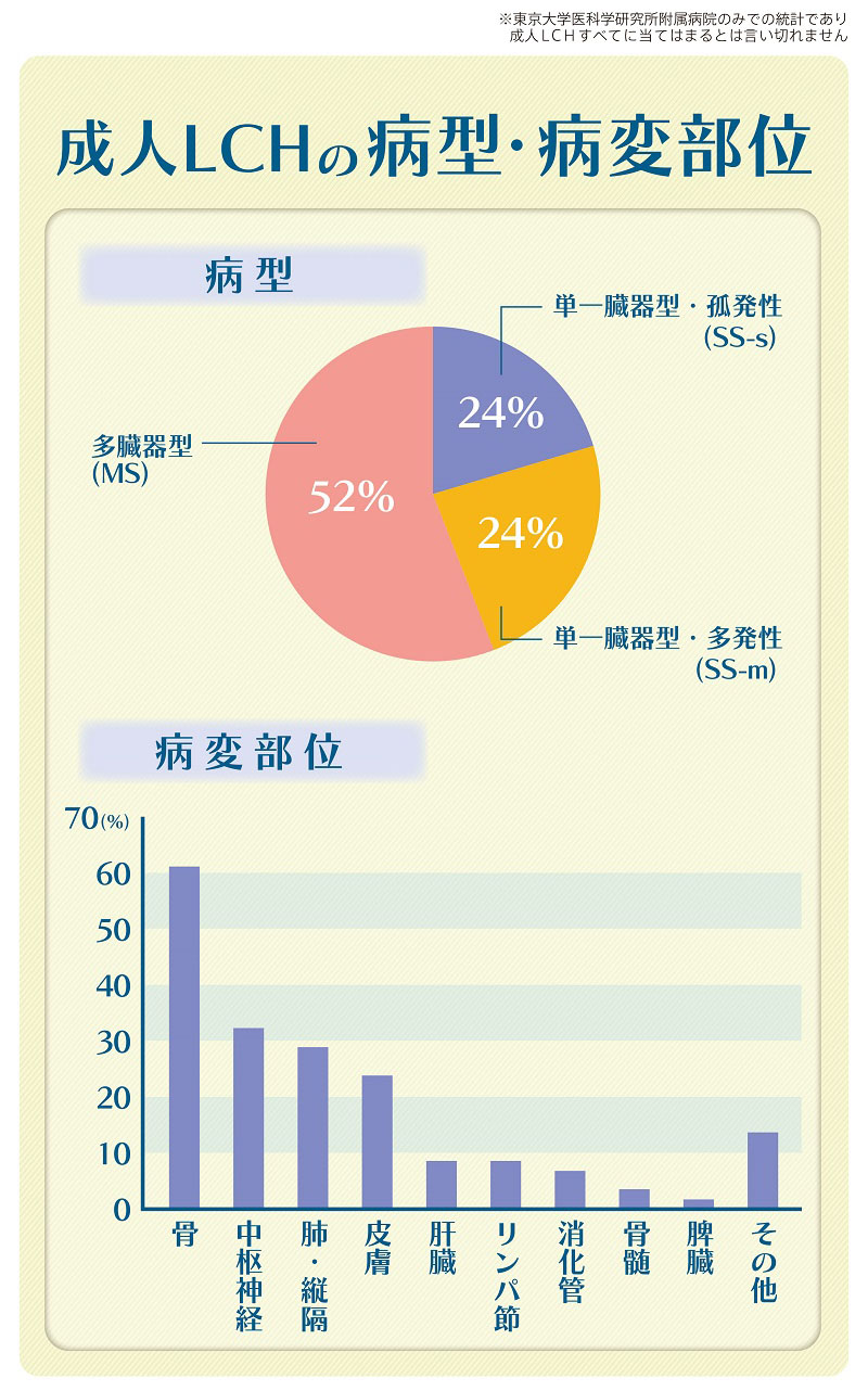 海外の報告では、20歳以降のLCH発症率は人口<100万人あたり2人の割合とされており、小児LCH(100万人あたり5人)の半分以下と考えられています。残念ながら、成人LCHに関する疫学調査のデータは国内外を問わず少ないため、この数字がどこまで正確なのかわかりません。