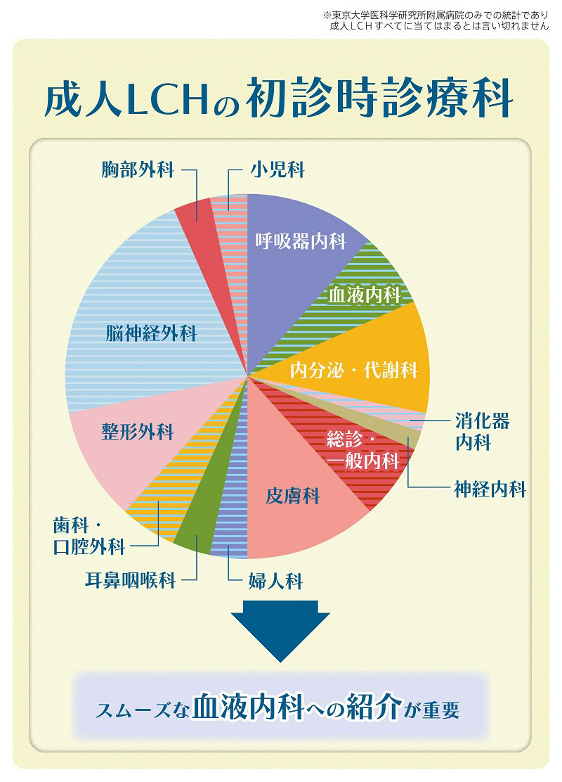 成人LCHの場合、症状や病変部位に応じて受診する診療科が多岐にわたってしまうのは仕方ありませんが、そこから如何にスムーズに血液内科に紹介されるかがポイントになるわけです。