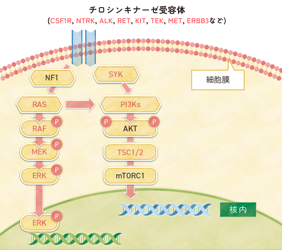 2010年にLCHの約半数の例で病変組織にBRAFV600E変異が検出されることが報告され2)、これを契機にMAP2K1などMAPK経路の遺伝子に活性化変異が次々に同定された。LCH患者の90%にMAPK経路に活性化遺伝子変異を認め3)、この変異はドライバー変異である4)。ECD患者にも半数近くにBRAFV600E変異を認め5)、NRASやKRAS等を含め90%にMAPK経路に活性化遺伝子変異が検出される4)。(図1)