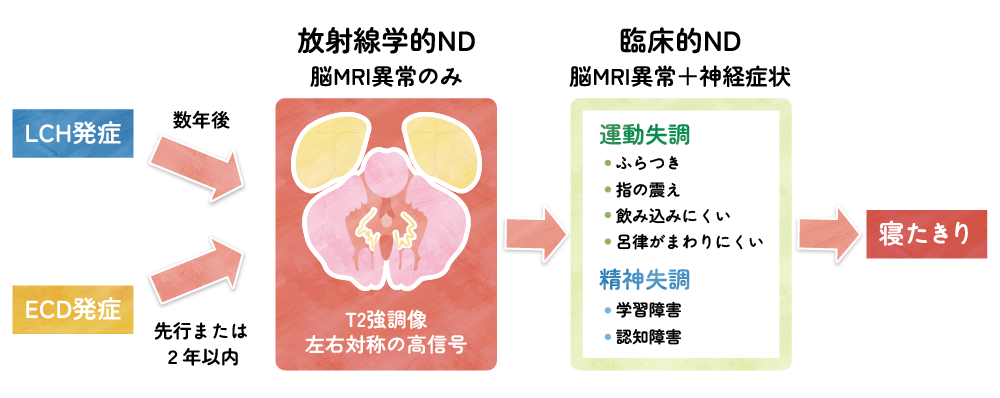 LCHにおいて、LCH発症から数年以上経過し、腫瘍性病変が消失した時期に、小脳失調や高次脳機能障害が非可逆的に進行する中枢神経変性症(neurodegenerative disease: ND)が続発することが、1990年代前半から知られていた6)。ECDにおいても、診断時から徐々に進行する同様のNDの存在が、1990年代半ばから知られていた7)。最近、XGにおいても、同様のNDが報告されている8)。